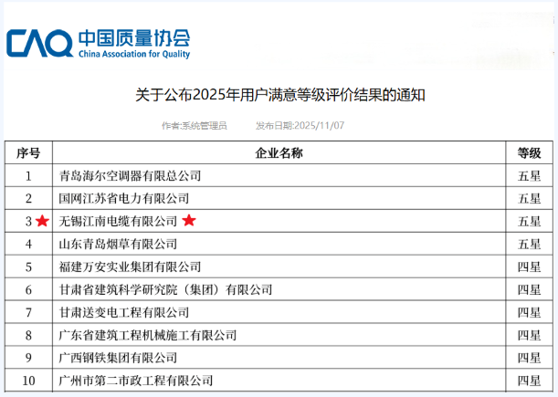 【喜報】江南電纜榮膺 “用戶滿意五星級企業(yè)” 稱號!